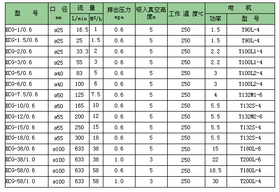 KCG高溫齒輪油泵●用途 塑料橡膠加工工業(yè),紡織印染工業(yè),涂料工業(yè),木材加工工業(yè),食品業(yè)、造紙印刷等液態(tài)熱載體加熱載體加熱傳輸等各種工業(yè)。 ●應用范圍 KCG高溫齒輪油泵適用于輸送不含固體顆粒和纖維,無腐蝕性的高溫液體,介質溫度可達250℃,粘度為5-1500cst。 ●結構型式 本系列的齒輪泵由齒輪、軸、泵體泵蓋、軸端密封等零部件組成,所有零件均選用合適的耐溫材料制造。泵內運轉零件均利用其輸送的介質潤滑。 KCG型泵配有安全閥,可防止超載對泵和電機造成損壞。 常用KCG高溫齒輪油泵性能參數表