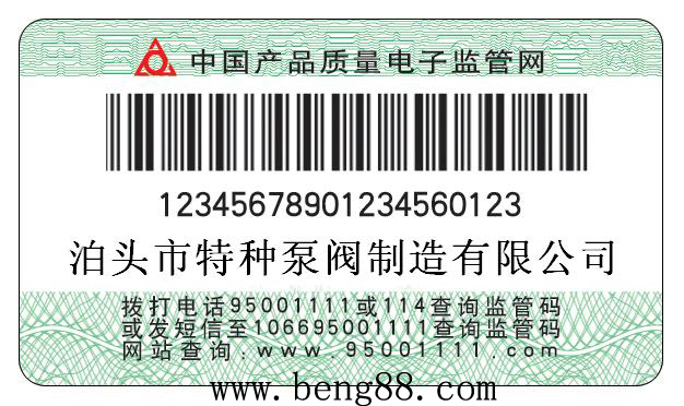 泊頭市特種泵閥制造有限公司自2008年5 月1 日出廠的產(chǎn)品,在產(chǎn)品合格證上粘貼長方形監(jiān)管碼標(biāo)簽,上有20位數(shù)字,這就是產(chǎn)品監(jiān)管碼。因此,我公司生產(chǎn)的每件產(chǎn)品都將有一個(gè)“電子身份證”??梢岳霉潭娫?、手機(jī)短信、互聯(lián)網(wǎng)、超市終端等網(wǎng)絡(luò)通訊設(shè)備對電子監(jiān)管碼進(jìn)行查詢,辨別真?zhèn)?。查詢辦法如下:
